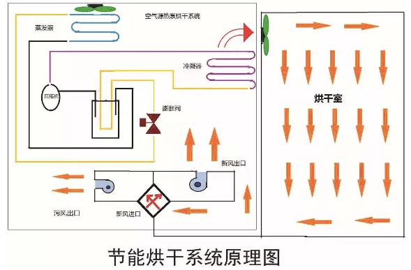 制冷劑被壓縮機(jī)加熱,成為高溫高壓氣體,進(jìn)入冷凝器,冷凝液化放熱,成為液體,同時(shí)將烘干房空氣加熱,從而達(dá)到提高烘干房溫度的目的。通過(guò)熱風(fēng)的形式使物料中的水分汽化蒸發(fā),蒸發(fā)出來(lái)的水蒸氣由排濕系統(tǒng)排走而達(dá)到烘干的目的。