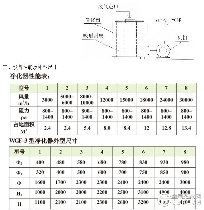 該設備附圖中的外型尺寸完全可以滿足設計及安裝要求,圖中表示氣流方向為上進下出,根據設計需要也可以下進上出。還可以根據廢氣的含量提出吸附劑層的厚度。吸附劑與含酸廢氣之間是一種化學反應,即從接觸面向里逐層反應,因此吸附效率逐漸下降。