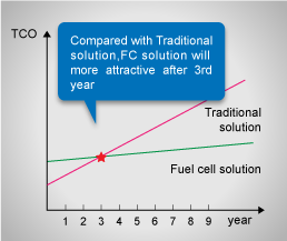 相比傳統(tǒng)備用電源解決方案,燃料電池備用電源的壽命可達(dá)十年,每年僅需要作簡(jiǎn)單的維護(hù),大大降低了運(yùn)營(yíng)商在生命周期中的設(shè)備建設(shè)成本和人員維護(hù)成本。同時(shí)燃料電池較好的環(huán)境適應(yīng)性使得所需的維護(hù)能耗低。如圖所示,3年之后,燃料電池備用電源相對(duì)傳統(tǒng)備用電源有著更顯著的投資回報(bào)率。