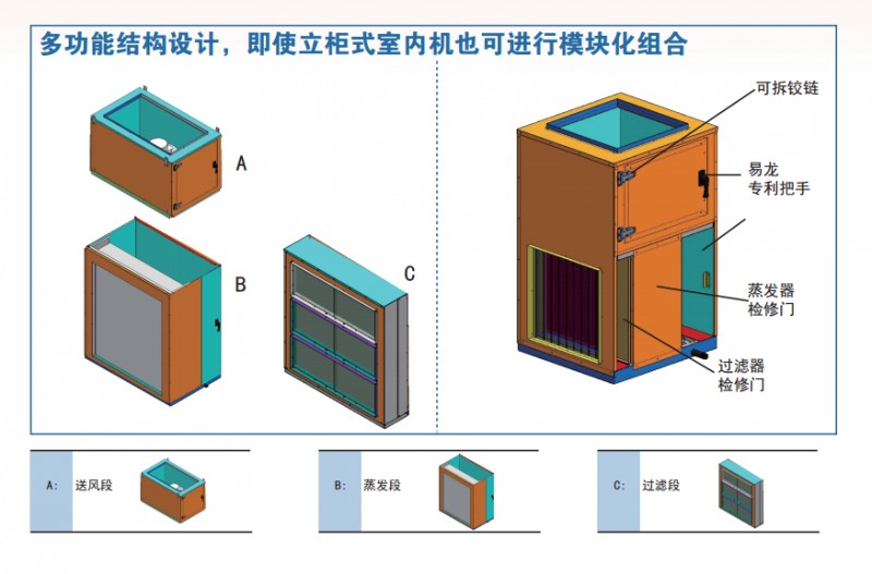易龍7EIV系列模塊化室內(nèi)空氣處理機(jī)組,使用了高質(zhì)量的結(jié)構(gòu)設(shè)計(jì),降低了空氣的泄露和滲透,以及最小化輻射噪音和提高了可維護(hù)性。這種模塊化的箱體設(shè)計(jì)不但能夠適應(yīng)復(fù)雜多變的應(yīng)用場(chǎng)景的挑戰(zhàn),還能夠任然保證其便捷的安裝和維護(hù)。雙層鈑金聚氨酯發(fā)泡結(jié)構(gòu)和直驅(qū)后傾無渦殼風(fēng)機(jī)保證了機(jī)組即使在較高的靜壓下也能夠持續(xù)低噪音、高效運(yùn)轉(zhuǎn)。7EIV系列模塊化室內(nèi)機(jī)全部標(biāo)配可鎖定鉸鏈門能夠非常方便的對(duì)設(shè)備內(nèi)部各個(gè)部件進(jìn)行檢修。