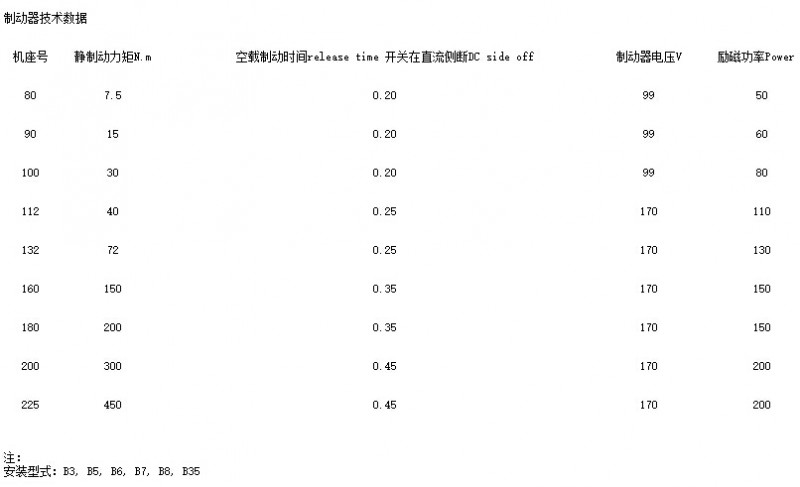制動方式:無勵磁制動。電磁制動器額定電壓:H100及以下者為直流99V、H112及以上者為直流170V。