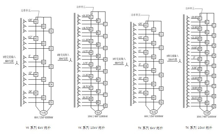 合康礦井風(fēng)機(jī)用高壓變頻器有HIVERT-YK和HIVERT-TK兩種系列。其中,HIVERT-YK適配異步電機(jī),HIVERT-TK適配同步電機(jī)。這兩種系列變頻器均由移相變壓器、功率單元和控制系統(tǒng)(包括:控制器、接口板和人機(jī)界面)構(gòu)成。