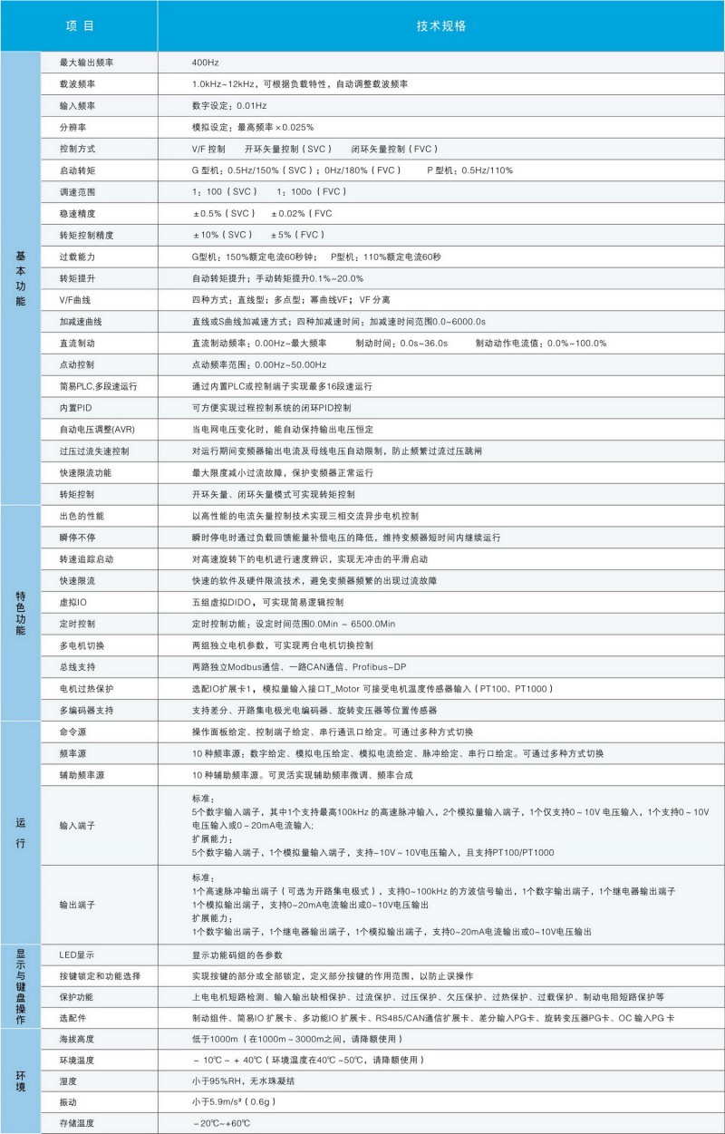 2. 具有優(yōu)異的VF控制性能,低頻力矩大、負(fù)載運(yùn)行穩(wěn)定;