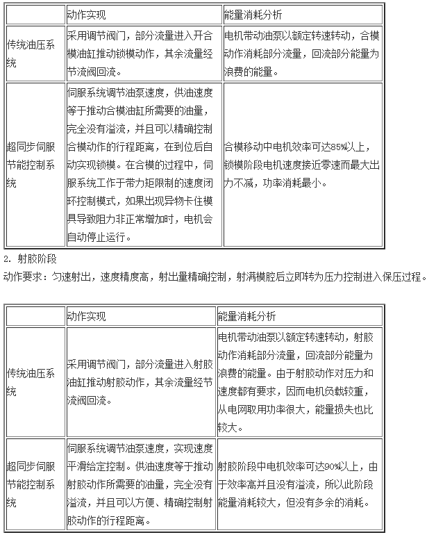 注塑機(jī)的用電量主要消耗在油泵電機(jī)上,在定量泵的液壓系統(tǒng)中,電機(jī)以50Hz高速運(yùn)轉(zhuǎn),油泵的供油量基本不變,遠(yuǎn)遠(yuǎn)大于注塑機(jī)工況的時間要求,多余的高壓油經(jīng)溢流閥全部回流至油箱,能量存在巨大的浪費(fèi)。我們可以采用超同步伺服節(jié)能控制系統(tǒng),使注塑機(jī)在不同工作階段伺服電機(jī)輸出功率,根據(jù)負(fù)載變化而變化,不存在多余能量浪費(fèi)。保壓和冷卻階段,能耗低級,幾乎為零。