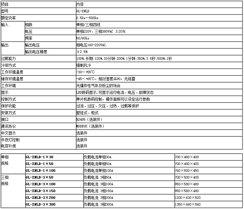 10、自動(dòng)穩(wěn)壓、三相分調(diào)、中文顯示、通訊接口(選配功能)。