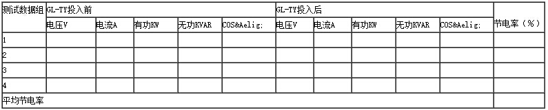 安裝后在同等狀況、同一測試點,用測試儀測量電流、有功、無功、功率因素,也可由節(jié)電器里面的(節(jié)電――旁路)選擇開關(guān)進行節(jié)電測試對比。測試表如下: