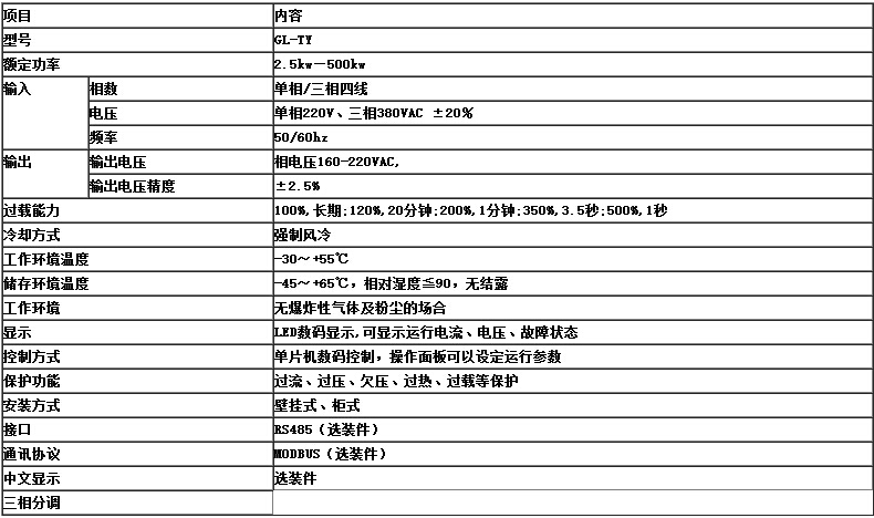 - 自動穩(wěn)壓,中文顯示,3相分調(diào),通訊接口(選配功能)。