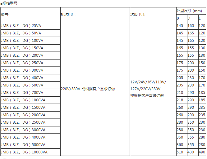 JMB、DG、BJZ、BZ系列照明變壓器適用于交流50HZ,電壓500V及以下的電路中,作為機(jī)床及其它設(shè)備的局部照明燈電源。