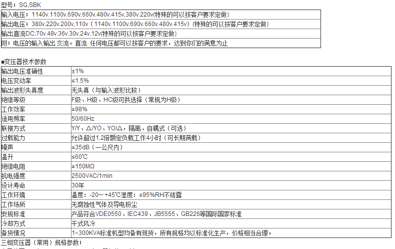 我公司多年來采用優(yōu)質(zhì)材料和先進的工藝技術(shù)專業(yè)生產(chǎn) 160VA--600KVA 之間,SG,SBK,TE/F.F/SG系列三相干式隔離變壓器,產(chǎn)品參照國外同類產(chǎn)品最新研制開發(fā)進口設(shè)備用變壓器,產(chǎn)品符合 VDE0550 、 IEC439 、 JB5555 、 GB5226 國際、國家標(biāo)準(zhǔn)。SG,SBK,TE/F.F/SG系列三相干式變壓器廣泛適用于交流 50/60HZ ,輸入、輸出電壓不超過500V 的各種供電場合。產(chǎn)品的各種輸入、輸出,電壓高低,聯(lián)接組別,調(diào)節(jié)抽頭位置,繞組容量分配,次級繞組配備,是否要求帶外殼等,均根據(jù)用戶的要求進行精心的設(shè)計與制造