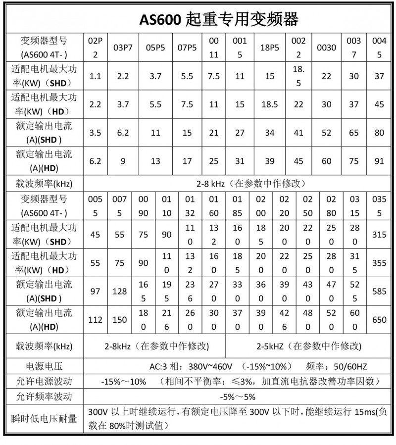 2、以上是在默認(rèn)載波下的額定電流,<=15kW,載波頻率為6k;<30kW,載波頻率為5k;<=55kW,載波頻率為4k;<=75kW,載波頻率為3k;>75kW,載波頻率為2k。