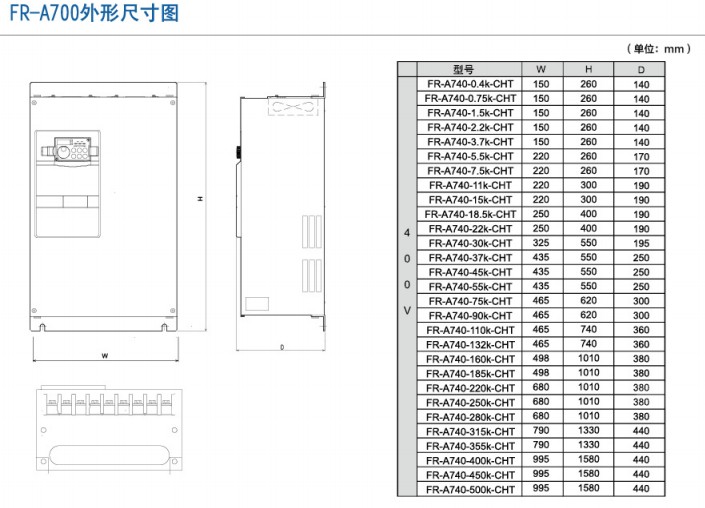| FR-A740-450K-CHT | 560 1094A | 500 962A | 450 866A | 400 770A |