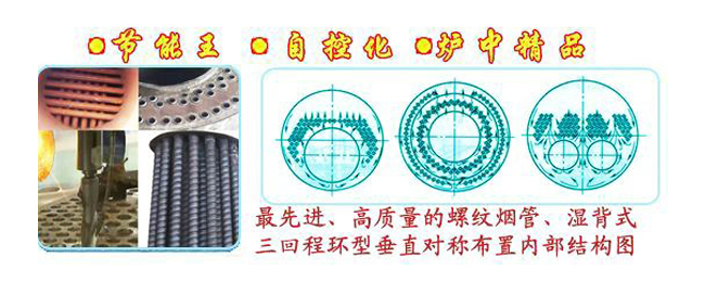 ★ 爐膛上部采用最先進(jìn)、高質(zhì)量的螺紋煙管、濕背式三回程環(huán)型垂直對(duì)稱布置結(jié)構(gòu)?;鹧嬖诟吡魉俚囊L(fēng)下在管內(nèi)繞旋運(yùn)動(dòng),管內(nèi)螺紋有效阻止并延長(zhǎng)了火焰通道和經(jīng)過(guò)時(shí)間,通過(guò)多回程上下反復(fù)流動(dòng)燃燒,使熱能與水充分換熱,是普通管的2倍左右,達(dá)到排煙溫度150℃左右的低溫排放,從而達(dá)到節(jié)能效果最佳程度,鍋爐尾部采用旋風(fēng)脫硫除塵技術(shù)有效去除尾氣殘余和有害物質(zhì),達(dá)到環(huán)保排放要求。
