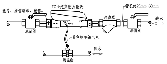 專用測溫球閥安裝或用套管安裝,根據(jù)現(xiàn)場實際情況,確定進水側(cè)安裝或回水側(cè)安裝。