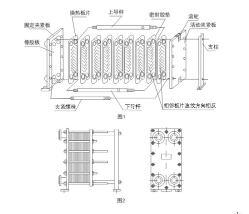 板式換熱器主要部件是由換熱板片、密封膠墊、夾緊板、導(dǎo)桿、夾緊螺栓組成。換熱板片是由不銹鋼板壓制成型,它上面開有4個(gè)流道孔,中部壓成人字形波紋,四周壓有密封槽。密封槽內(nèi)粘有密封膠墊。換熱板片通過兩導(dǎo)桿定位對齊,兩夾緊板通過夾緊螺栓將各板片壓緊,從而形成換熱器內(nèi)腔換熱流道。相鄰換熱板片的人字形波紋方向安裝時(shí)相反,接觸點(diǎn)彼此相互支撐。人字形波紋和這些支撐點(diǎn)使流體介質(zhì)在其內(nèi)部流動(dòng)時(shí)充分形成湍流,這是板式換熱器具有很高換熱效率的主要原因。另外換熱板片厚度較薄,導(dǎo)熱熱阻較小,板片兩側(cè)的流體介質(zhì)流動(dòng)分布較為均衡,也使得傳熱較為充分。