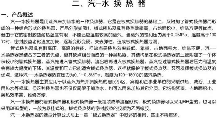 汽--水換熱器是用蒸汽來(lái)加熱水的一種換熱器,它是在板式換熱器的基礎(chǔ)上,又附加了管式換熱器而形成的一種組合形成的換熱器,板式換熱器具有換熱效率高、占地面積小、維修方便等優(yōu)點(diǎn),但由于它的密封膠墊耐熱溫度有限,不能適應(yīng)溫度高的蒸汽。
