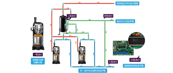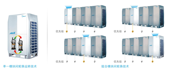 系統(tǒng)根據(jù)系統(tǒng)負(fù)荷情況,輪換設(shè)置優(yōu)先開啟的室外機(jī)模塊的壓縮機(jī)順序,平衡分配每臺室外機(jī)模塊的運(yùn)行時(shí)間,大大提高了機(jī)組的可靠性和使用壽命。