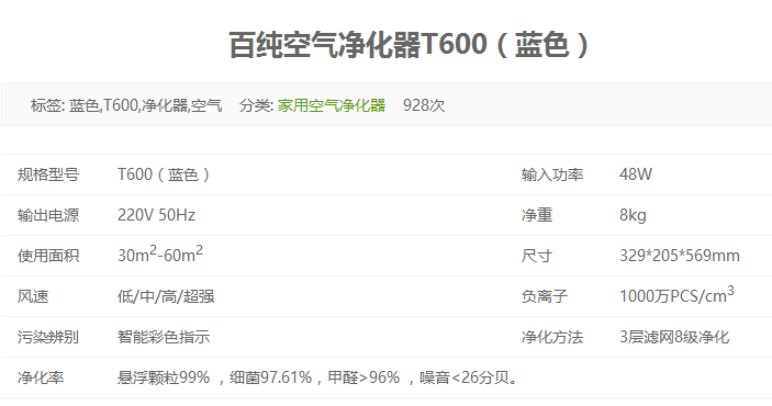 百純空氣凈化器T600(藍(lán)色) 百純智能凈化器