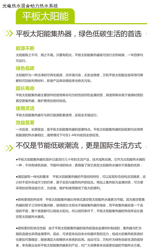 * 集熱管路承壓,系統(tǒng)自動(dòng)實(shí)現(xiàn)間接換熱,徹底解決平板的防凍和防垢問(wèn)題,高寒地區(qū)冬季同樣適用;