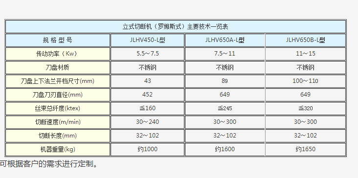本機是化纖短纖后加工聯(lián)合機中的單元機之一,是將經(jīng)過曳引張力機后具有一定張力的長絲束切成定長的短纖維,送往打包機進行打包。本機為立式壓切式切斷機,可按不同槽數(shù)設計刀盤,分別能切成棉型中長及毛型纖維要求的纖維長度。