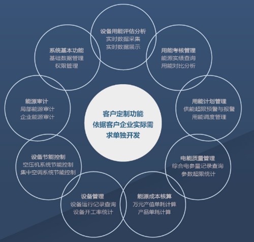 企業(yè)能源管理中心是多層次、模塊化、全局性的綜合管理系統(tǒng)。其中包括9大基本功能模塊及用戶定制功能模塊。