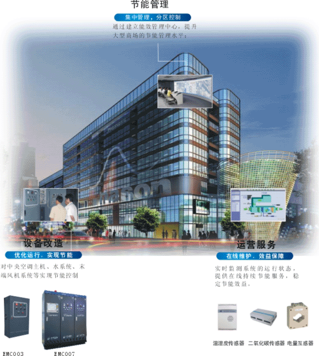 大型商場節(jié)能解決方案基于對大型商場的了解,**公司綜合采用中央空調(diào)運行仿真技術(shù)、冷凍機組控制技術(shù)、水系統(tǒng)變溫差變流量節(jié)能技術(shù)、風(fēng)系統(tǒng)變頻技術(shù)、系統(tǒng)整體及分區(qū)控制技 術(shù),自主研發(fā)了的“**能源監(jiān)測管理系統(tǒng)(EMC002)”,“**中央空調(diào)管理節(jié)能系統(tǒng)(EMC003)”,以及“**中央空調(diào)節(jié)能控制系統(tǒng) (EMC007)”,通過上述系統(tǒng)的組合應(yīng)用,提出了針對大型商場的整體節(jié)能解決方案,以滿足購物舒適度為前提,幫助商場實現(xiàn)能效提升。