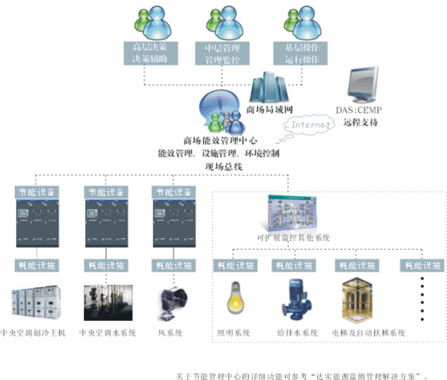商場能效管理中心由能效管理、設(shè)施管理、環(huán)境控制組成三層能效監(jiān)測管理系統(tǒng),從管理角度使商場獲得能效提升,同時,對穩(wěn)定節(jié)能效果也起到一定的作用。用能單位可以從管理中心獲知每日商場的用電情況,并及時對異常情況進(jìn)行調(diào)整。