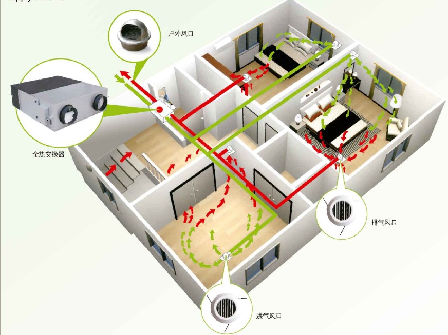 再來說單向流和雙向流。如果室外空氣質(zhì)量較好的話,最好使用單向流。因為單向流的作用就是使用機(jī)械的方式將室內(nèi)的空氣排出,室內(nèi)形成負(fù)壓后,室外的新鮮空氣通過門窗縫或墻上開的新風(fēng)進(jìn)風(fēng)口自動進(jìn)入。如果室外空氣質(zhì)量較差,空氣里灰塵量較大,或室外環(huán)境比較吵,可以采取雙向流的方式。