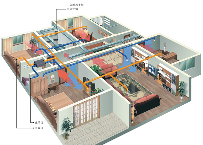 中央新風(fēng)系統(tǒng)是指室外新鮮空氣經(jīng) 過過濾后送到室內(nèi),同一時間把室內(nèi)污濁空氣排到室外,達(dá)到系統(tǒng)的平衡的同時也對房間進(jìn)行了空氣的置換,使一個密閉的空間實現(xiàn)科學(xué)的空氣對流,也等于給你的 房間增加了一個呼吸系統(tǒng)。它保證了在密閉的房間內(nèi)24小時都有清新的空氣,身在房間就如就如置身綠色森林之中一般舒暢,也保證了你的房子更加清潔安靜,隔 絕了室外的灰塵和噪音進(jìn)入房間,又能有效地避免由凝露水引起的房屋發(fā)霉的現(xiàn)象。它有兩種表現(xiàn)方式:一、單向流系統(tǒng);二、雙向流系統(tǒng)(分為帶熱交換和不帶熱 交換)。