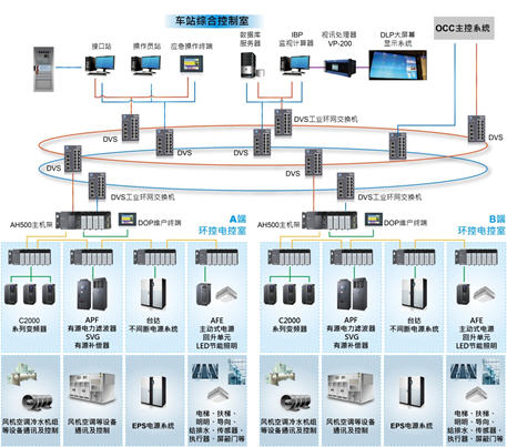 臺達(dá)鐵道交通系統(tǒng)主要針對“環(huán)境調(diào)節(jié)”和”設(shè)備監(jiān)控“兩大項控制系統(tǒng)進(jìn)行整合,應(yīng)用在鐵道全線所有的車站、停車場、車廂、臨時監(jiān)控中心、區(qū)間隧道內(nèi)設(shè) 置的各種設(shè)備(包括通風(fēng)空調(diào)設(shè)備、給排水設(shè)備、照明設(shè)備、手扶電梯、電梯等)和緊急事故防災(zāi)救護(hù)設(shè)施(防煙系統(tǒng)、緊急照明系統(tǒng)等)進(jìn)行實時的監(jiān)控管理,并 確保其運(yùn)作安全可靠。