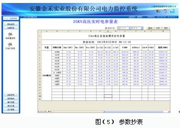 參數(shù)抄表功能,主要所有回路的電參數(shù)進(jìn)線查詢。支持任意時(shí)刻電參數(shù)查詢,具備數(shù)據(jù)導(dǎo)出和報(bào)表打印等功能。該報(bào)表查詢供35KV變電所6臺(tái)主變和6臺(tái)直變的電參數(shù),主要包括:三相電壓、三相電流、有功功率、無功功率、頻率和有功電度。該報(bào)表各回路名稱和數(shù)據(jù)庫關(guān)聯(lián),方便用戶修改回路名稱,如圖(5)所示。