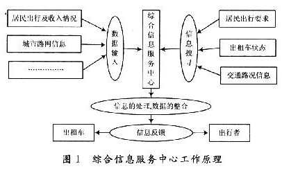 綜 合信息服務(wù)中心運(yùn)用系統(tǒng)工程理論將交通流誘導(dǎo)技術(shù)、差分GPS定位技術(shù)、GIS及地圖匹配技術(shù)、公共交通運(yùn)營優(yōu)化及評價(jià)技術(shù)、計(jì)算機(jī)網(wǎng)絡(luò)技術(shù)、數(shù)據(jù)庫技 術(shù)、通信技術(shù)、電子技術(shù)等集成為先進(jìn)的交通信息管理系統(tǒng)。綜合信息服務(wù)中心的基本工作原理(見圖1)可以描述為:通過GPS,GSM移動(dòng)通信技術(shù)進(jìn)行數(shù)據(jù) 和信息采集,結(jié)合居民出行調(diào)查、路網(wǎng)信息等靜態(tài)信息,以GIS為操作平臺,對信息進(jìn)行智能整合和優(yōu)化,實(shí)現(xiàn)出租車的智能調(diào)度和指揮,降低出租車的空載率, 節(jié)約出行者的等待時(shí)間,進(jìn)而達(dá)到提高城市公共交通運(yùn)營效率的目的。