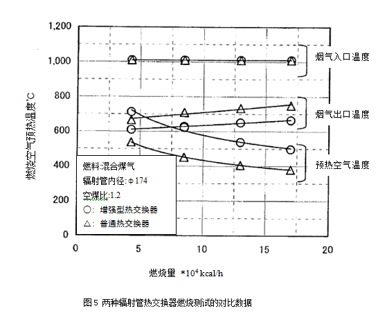 傳 統(tǒng)的低換熱型熱交換器可以將空氣溫度提高到350~400℃,而采用加強(qiáng)型熱交換器可以將空氣溫度預(yù)熱到650~700℃。煙氣排放溫度可以降低 70~100℃,實(shí)現(xiàn)節(jié)約煤氣5%~10%。該方案適合在傳統(tǒng)燒嘴的退火爐上進(jìn)行改造,投資小、見效快、改造量小。兩種熱交換器通過實(shí)驗(yàn)室模擬燃燒測試的 對比數(shù)據(jù)見圖5。