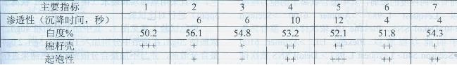 注:棉籽殼的存在情況的評(píng)價(jià):棉籽殼少“+”棉籽殼中等“++”棉籽殼較多“+++,’處理液巾的起泡性評(píng)價(jià):起泡低“+”起泡巾等“++”起泡較多“+++’