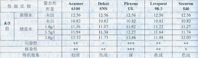 由表6得出,用硬水進(jìn)行染色的情況下,加入不同的螯合分散劑,其中Plexene UL最好,其次為Acumer 6100,它們對(duì)提高染色的深度和鮮艷度效果比較明顯,接近或達(dá)到用蒸餾水進(jìn)行染色的水平;Securon 540、Dekol SNS、Levquest L一983也有作用,但對(duì)染色色光有不同程度的變化,均有色淺的效果。