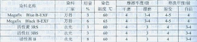 染色后皂洗工藝:皂洗劑2g/l,浴比1:20,溫度85-95℃,時(shí)問20分鐘從上述選擇的活性染料進(jìn)行各項(xiàng)牢度試驗(yàn)來看,ELE型、HF型和B型染 料均是以共價(jià)鍵的形式與纖維結(jié)合,按照常規(guī)加鹽加堿的方法,充分皂洗去除浮色,各項(xiàng)牢度指標(biāo)都能達(dá)到3級(jí)以上,其中ELE型和B—EXF型活性染料最為理 想。