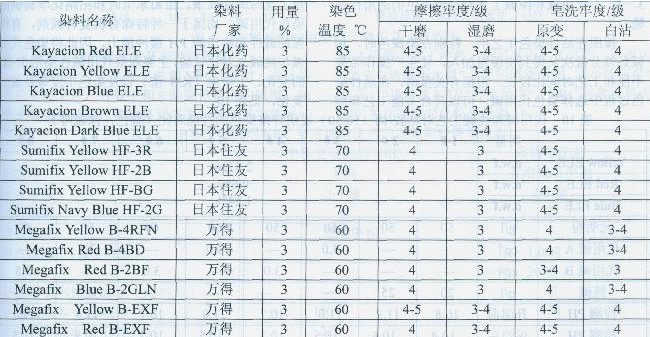 我們選擇目前許多工廠常用的活性染料,如:永光染料的Everzol ED、萬得染料Megafix B型系列、日本化藥Kayacion ELE型、日本住友SumifixHF等活性染料。