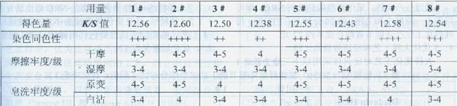 注:染色性能情況的評(píng)價(jià):好“+++”較好“++”一般“+”