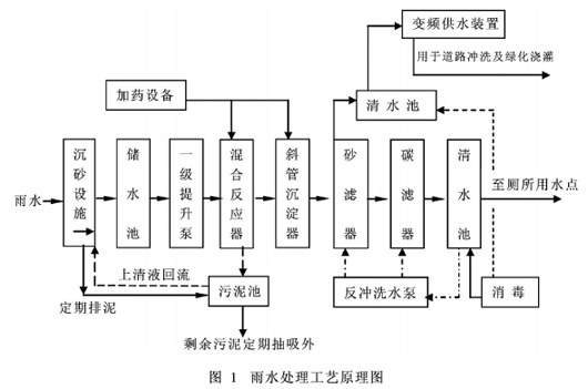 雨水作為一種自然資源,污染少,處理容易,經(jīng)簡易的處理即能作為生活用水,其處理工藝原理見圖1。
