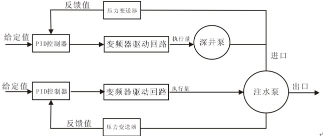 通常油田注水站注水泵流量大多采用傳統(tǒng)的水源井深井泵,將水供到儲(chǔ)水大罐,再由喂水泵將水從儲(chǔ)水罐供給注水泵,最后由注水泵將水注入地層。注水泵電機(jī)大多為大功率電機(jī),注水泵出口壓力通常是通過(guò)調(diào)節(jié)閥門(mén)實(shí)現(xiàn),操作人員隨時(shí)靠觀(guān)察壓力表的壓力來(lái)調(diào)節(jié)閥門(mén),而水泵電機(jī)的額定轉(zhuǎn)速基本保持不變,這樣,對(duì)電機(jī)而言,浪費(fèi)電能現(xiàn)象十分嚴(yán)重,管網(wǎng)水泵多,流程復(fù)雜,浪費(fèi)電能又增加了操作人員的勞動(dòng)強(qiáng)度。