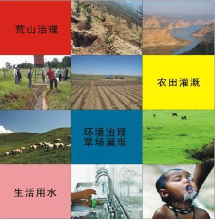 應(yīng)用范圍包括荒山治理、草場灌溉、人畜飲用、作物灌溉、生態(tài)保護(hù)區(qū)治理供水、泉、為養(yǎng)魚、養(yǎng)蝦池、船舶生活用水、增氧等多個(gè)方面。