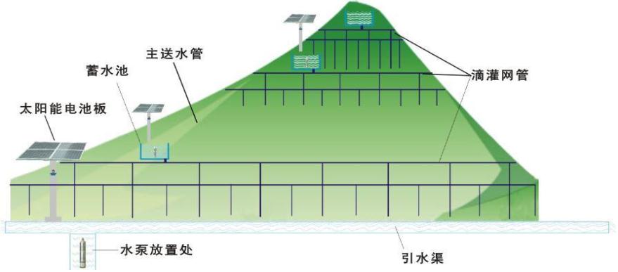 荒山綠化過程中植被灌溉成為最大問題,高昂的電網(wǎng)架設(shè)和用電費(fèi)用成為目前荒山綠化的瓶頸。光伏水泵取水系統(tǒng)因地制宜的利用太陽能資源和地下水資源,配置滴灌及智能控制系統(tǒng),是荒山治理過程中解決植被灌溉的最有效的途徑。