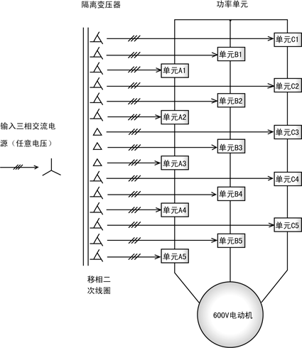 6kV系列:一般由15個(gè)功率模塊組成,每5個(gè)功率模塊串聯(lián)成一相,三相Y接。