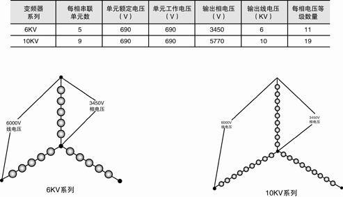 HY高壓變頻器每相由多個(gè)功率單元串聯(lián)而成,各個(gè)功率單元由隔離變壓器的二次線圈分別隔離,移相電源通過改變串聯(lián)單元數(shù)量,可以很方便地得到不同電壓等級(jí)的輸出,而不受功率器件耐壓的限制。如額定電壓6kV變頻器的每相由5個(gè)功率單元組成,功率單元額定電壓為690V,串聯(lián)后相電壓為3450V(對(duì)應(yīng)線電壓為6kV);額定電壓10kV變頻器的每項(xiàng)由9個(gè)功率單元組成,功率單元額定電壓為690V,工作電壓為640V。