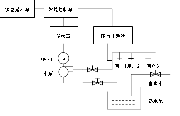 對于用水量大的用電單位多采用二次供水泵方式供給用戶,即把水先存在蓄水池中,利用多臺二次泵直接供給用戶。在高峰期(例如早上5:30~8:30,中午11:30~13:30,晚上17:30~24:00)使用多臺水泵(例如3臺);用水低谷時(24:00~5:03)只使用少數(shù)水泵(例如1臺),平時采用正常的水泵臺數(shù)(例如2臺)。由于用戶用水量是波動的,但不是階梯狀波動,這樣用水量和供水量存在不平衡。頻繁的開泵停泵給電機、水泵及管網(wǎng)造成沖擊,增加維護量。
