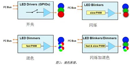 如果不使用PWM,那么它只能完成開和關的動作;低速的PWM只能實現(xiàn)LED閃爍,并不足以達到混色的目的;高速的PWM就可以實現(xiàn)RGB混色;如果 PWM速度可控,那么就可以實現(xiàn)閃爍和混色的雙重功能。而且通過可控的8bit/256階PWM,加大了色階提升了色彩的層次感。見下圖2所示。