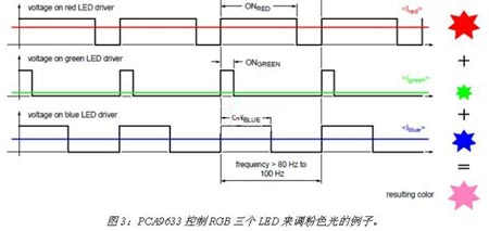 知道了混色的原理,那么一個具體的色彩又是如何產生的呢?我們知道人眼對色彩的感知是各種色彩亮度均值的疊加,我們可以通過控制PCA9633每個 PWM的占空比,去控制所驅動LED的亮度。根據三基色原理,如果我們驅動的是RGB(或者RGBA)LED,那么通過調節(jié)這三個LED的不同光亮,就可 以得到所要的色彩。圖3是PCA9633控制RGB三個LED來調粉色光的例子。