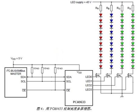 除此之外,由于I2C器件地址的唯一性,可以按所驅動LED的數量使用幾個PCA9633來進行控制。如果實際應用中PCA9633本身的驅動電流不 夠,只需在外圍加一個FET就可以輕松解決。另外,PCA9633獨有的Group PWM使得控制整個亮度條的光強和閃爍變的得心應手。下面是其原理圖(見圖4),其中I2C master由系統(tǒng)提供,可以是MCU,也可以是邏輯電路。