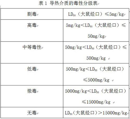 在討論導(dǎo)熱介質(zhì)的毒性之前,讓我們先了解一下毒性衡量標(biāo)準(zhǔn)以及分級。通常物質(zhì)的毒性通過急性毒性來測定,以大鼠經(jīng)口LD50值為指標(biāo)判定毒性大小,大 鼠經(jīng)口LD50值是指把不同劑量的被試驗(yàn)物質(zhì)經(jīng)口注入大鼠體內(nèi),在14天內(nèi)足以使占全體數(shù)量50%的個(gè)體在試驗(yàn)條件下致死的劑量稱為LD50(致死量 50%),一般用每kg體重所使用的毒物mg數(shù)表示(即mg/kg)。根據(jù)我國《工業(yè)化學(xué)品毒性鑒定規(guī)范及實(shí)驗(yàn)方法》并參考美國科學(xué)院對毒性物質(zhì)的劃分, 可將毒性分級如表1。