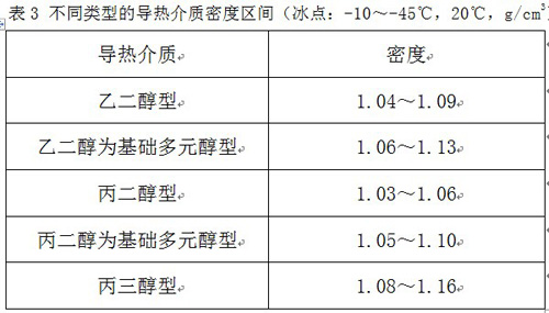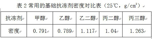 導(dǎo)熱介質(zhì)或者防凍液的密度雖然不能直接反映產(chǎn)品的各種性能,但是通過密度我們可以基本判斷出產(chǎn)品的類型及組分,通過表2可了解到常用的抗凍劑的原始密度。