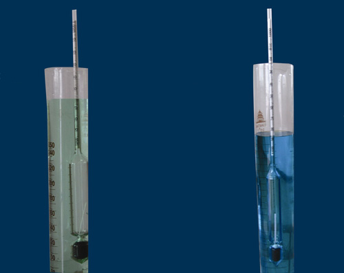 左圖:冰點(diǎn)為-25℃的劣質(zhì)防凍液的密度僅有0.957g/cm3(25℃) 右圖:冰點(diǎn)為-25℃的太陽能專用導(dǎo)熱介質(zhì)的密度為1.085g/cm3(25℃)